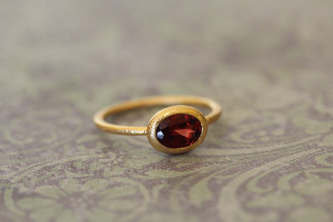 Vermeil over 925 sterling silver featuring bezel set garnet. Size 7.